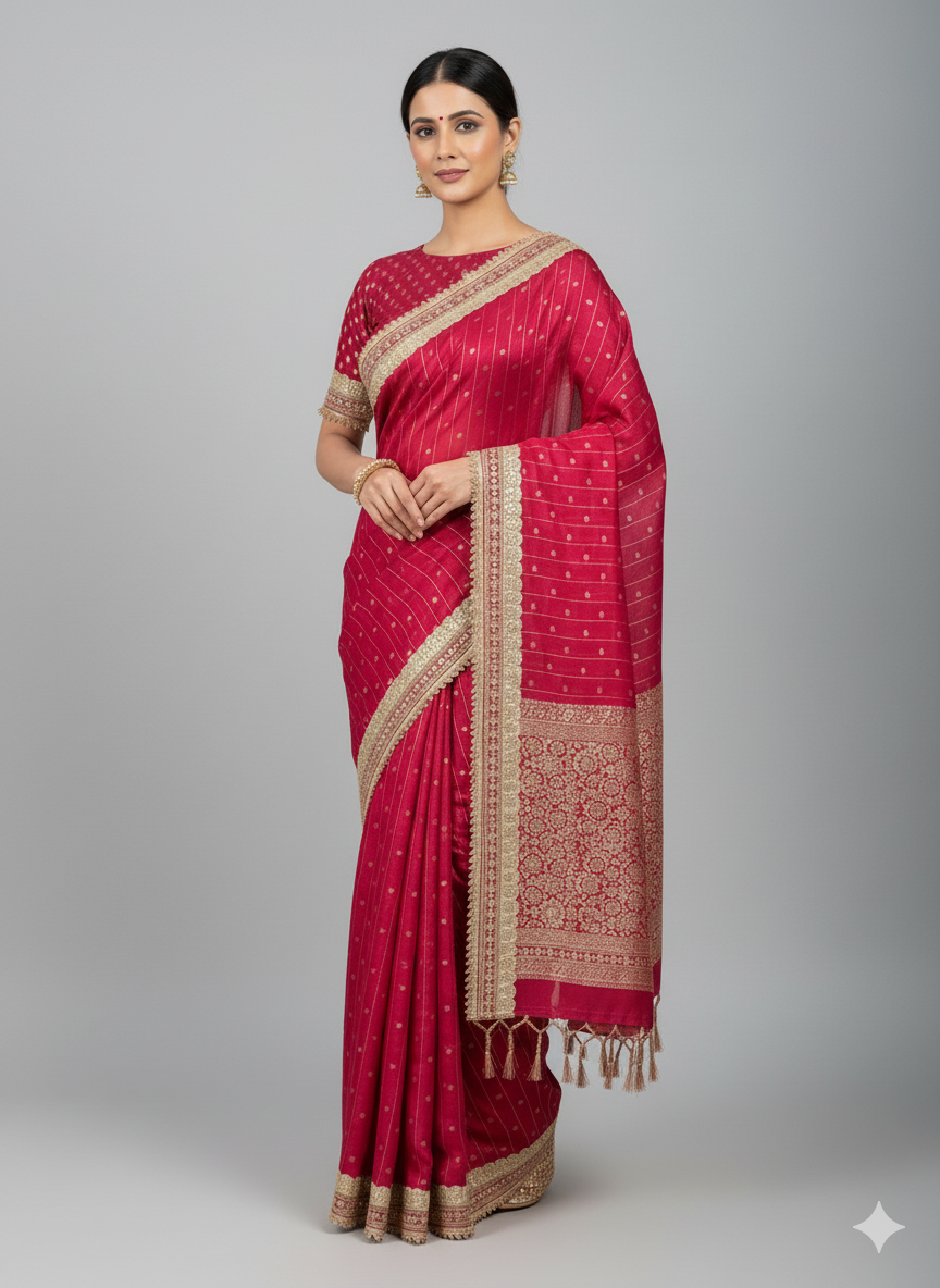 Featuring Banarasi heavy velvet lace mehrab border and a rich lace pallu, this saree is designed to make you stand out with grace and grandeur. 🌸