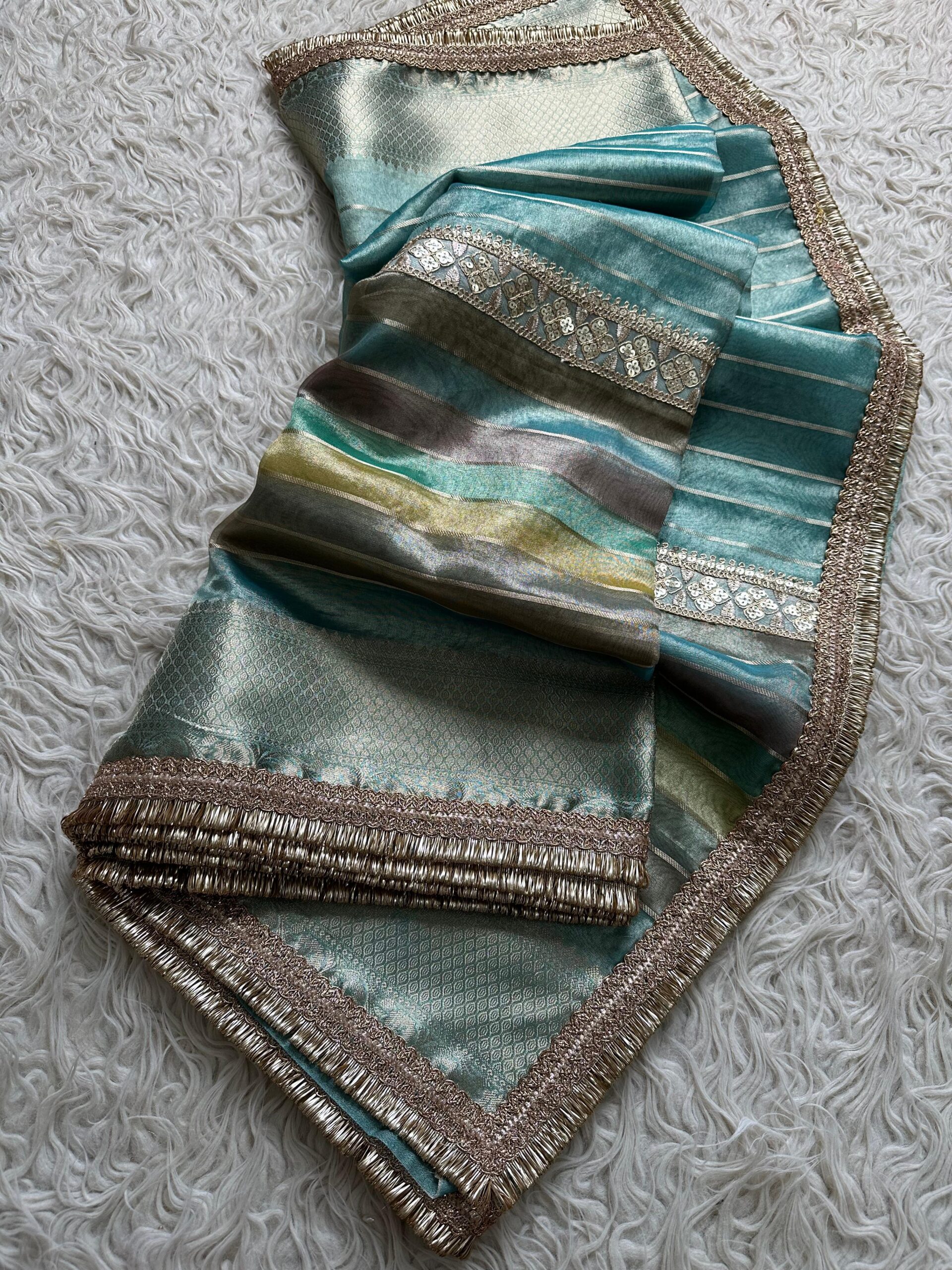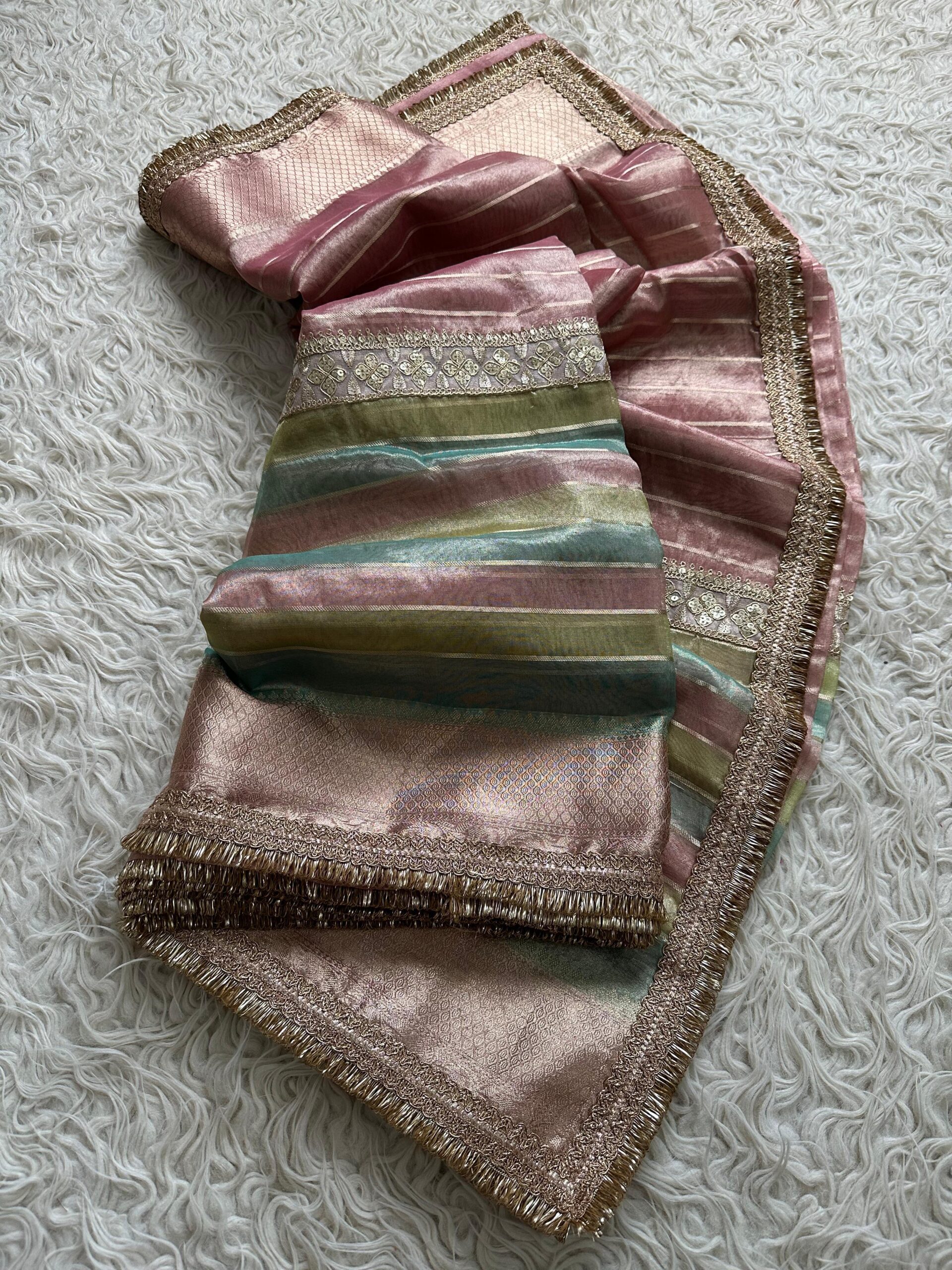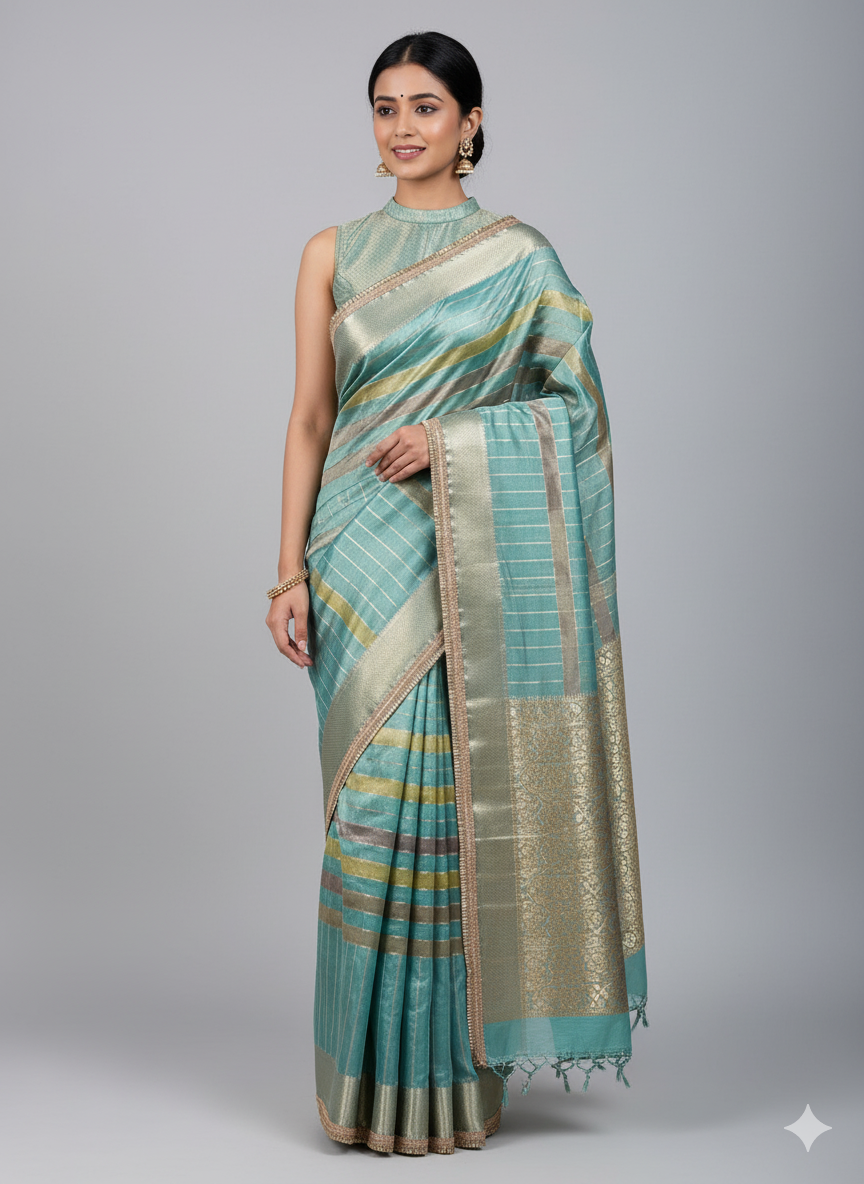 A saree that blends heritage with modern grace – adorned with golden zari borders, elegant tissue strip body, and a rich jacquard lace pallu.